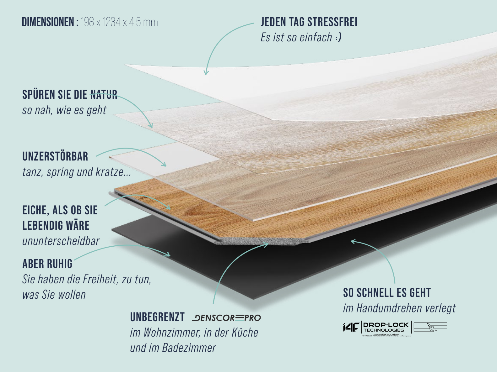 SEHR WIDERSTANDSFÄHIGNEUE DLE+ TECHNOLOGIENATÜRLICHE HOLZOPTIK